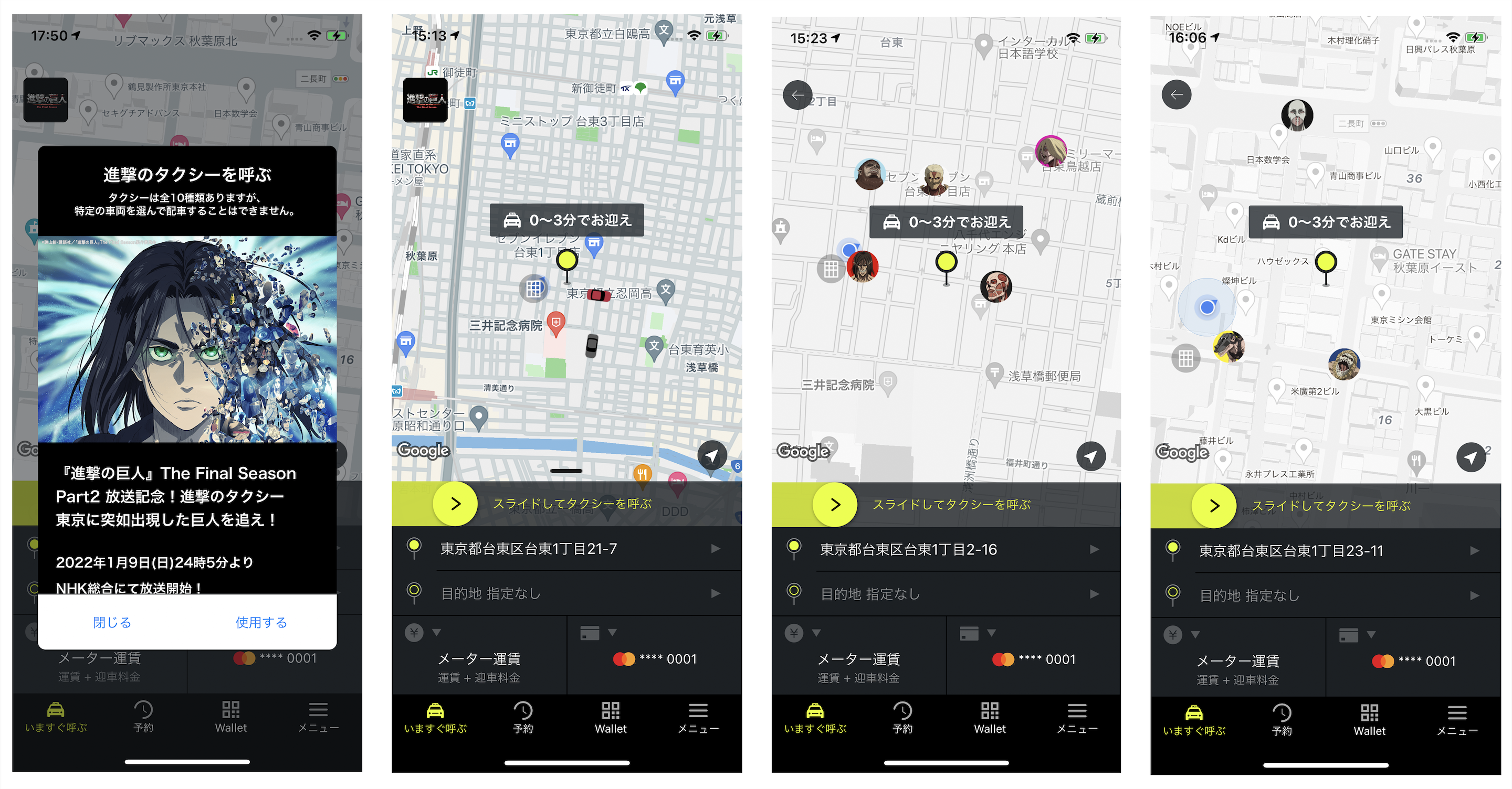モビリティテックや動画マーケティング事業を展開する株式会社ニューステクノロジー(本社:東京都港区、代表取締役:三浦純揮、以下ニューステクノロジー)とタクシーアプリ「S.RIDE」を提供するS.RIDE株式会社(本社:東京都台東区、代表取締役:西浦賢治、以下S.RIDE)は、NHK総合でのTVアニメ『進撃の巨人』The Final Season Part 2 の放映を記念した年末年始の特別コラボレーション企画を決定。「S.RIDE」で呼べる『進撃のタクシー』が、2021年12月27日(月)〜2022年1月9日(日)の期間限定で都内を走行することをお知らせします。