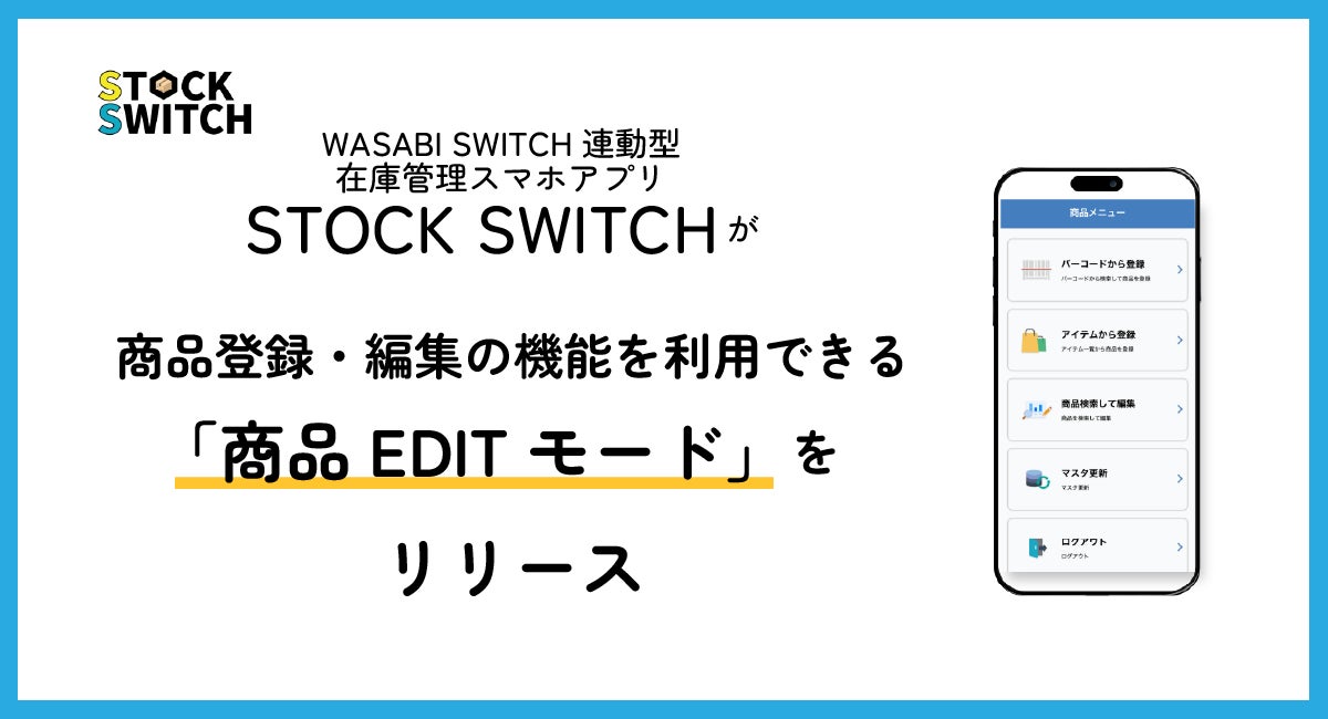 株式会社ワサビ(本社:大阪府大阪市 代表取締役:大久保裕史)は、EC一元管理システム「WASABI SWITCH」の連動型スマホアプリ「STOCK SWITCH」に、商品の登録・編集をより簡単に行える「商品EDITモード」を追加したことをお知らせいたします。