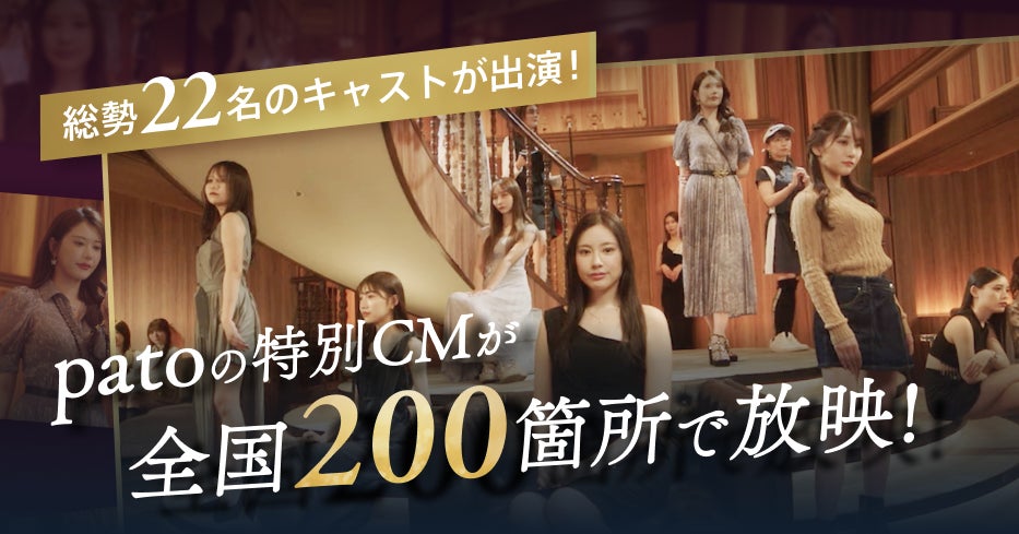 ご利用シーンを想定し、ラグジュアリーな雰囲気の空間にて撮影されたCMには、マジシャン・ゴルファー・ホステス・モデルなど、実際にpatoへ登録しているキャスト20名以上が出演。