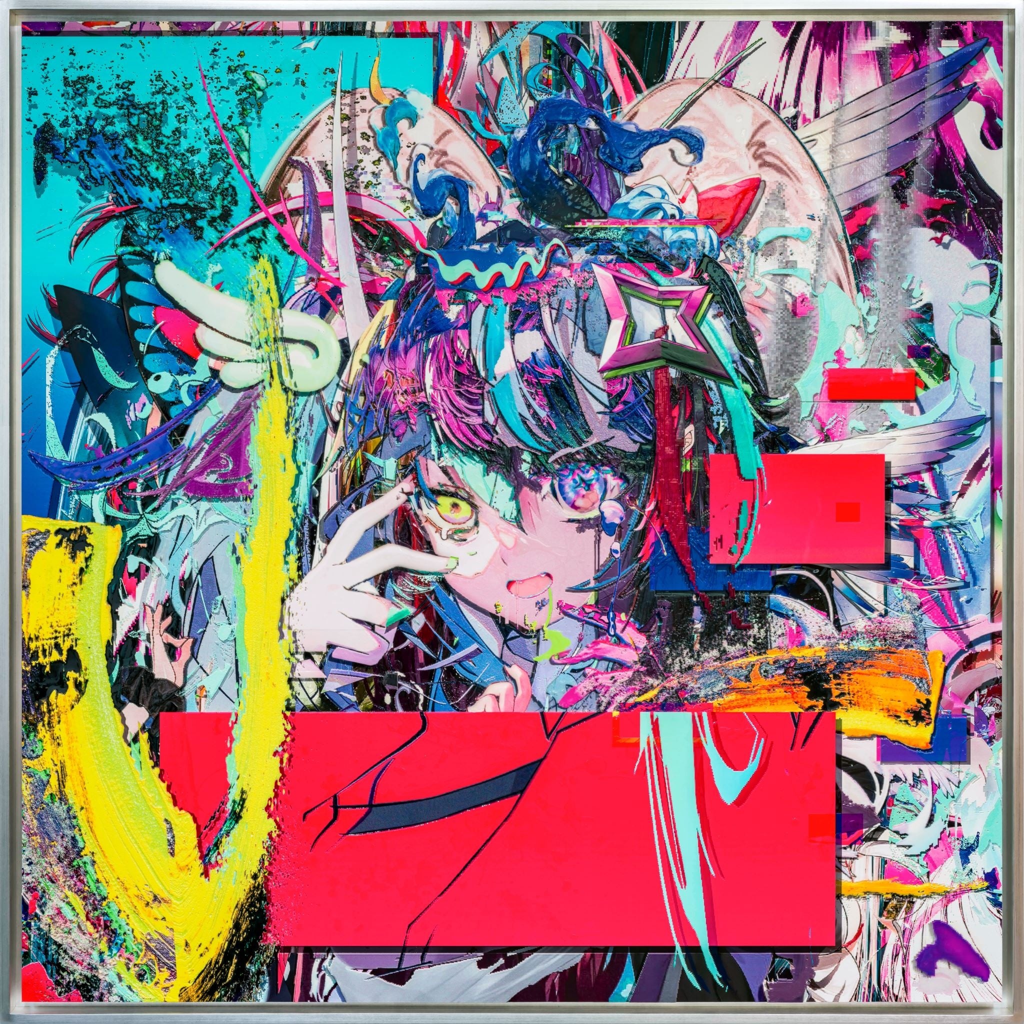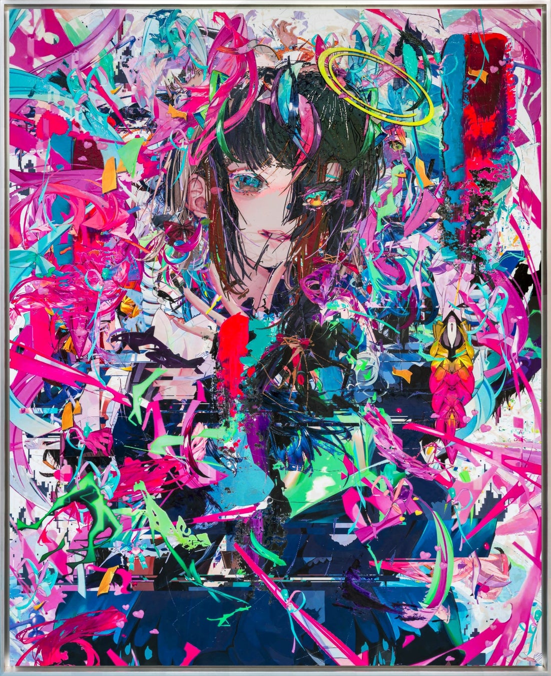 私が物質としての作品を作り続けているのも同じことが言える。データのみで成立しうるアート作品は改めて説明するまでもなくさまざまな選択肢とともに存在している。しかし、物質としての支持体と絵具、粒子との絡み合いを捨てきれずにいる自分がいる。物質としての身体に縛られているとも言える。同時に、印刷物として存在する前、粒子や顔料に変換される前の細かなピクセルのひとつひとつも捨てきれずにいる。その両方を捨てずに作品として具現化するため、データで画像を作り印刷して加筆するという手段を用いている。暫定的な手段として扱ってきたつもりだが、StareReapはその暫定的な手段としては十分過ぎるほどの強度を持つ技術だと思う。物質と仮想の電子の光、両方の表現を繋ぐメディウムとして心強い。そこにはディスプレイ上で制作した画像と、自らの手による加筆が反映されている。一見平面に見えるようで、非常に細かな立体感があり、増え続け消費され続けてきたキャラクター達のゴーストが、物質として別の形で現出したかと錯覚するようだ。