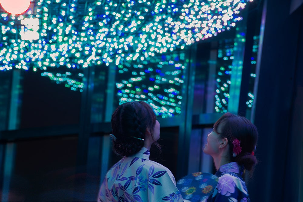 無数のLED電球を夜空に瞬く「天の川」に見立て、涼しげな光で夏の風情を演出する恒例の「天の川イルミネーション」。