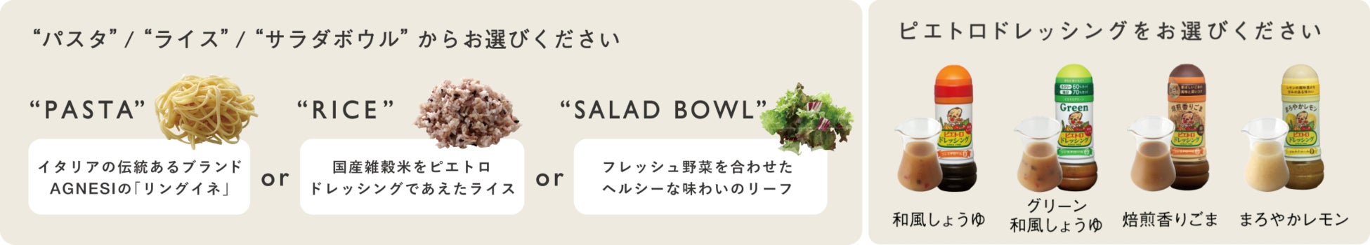 健康意識が高まる昨今、「ピエトロドレッシングでもっと野菜をたっぷり楽しみたい!」というお客様のお声から『PIETRO MIOMIO』のサラダボウルは生まれました。メイン食材やドレッシングの組み合わせをご自身で選んでいただくことができ、手軽にその日の気分に合わせたサラダをお楽しみいただけます。メインメニューについては、サラダパスタ/サラダライス/サラダボウルが選択でき、ドレッシングも定番の4種からお好きなものをお選びいただけます。(※今回受賞した2品は食材の選択はできません。)