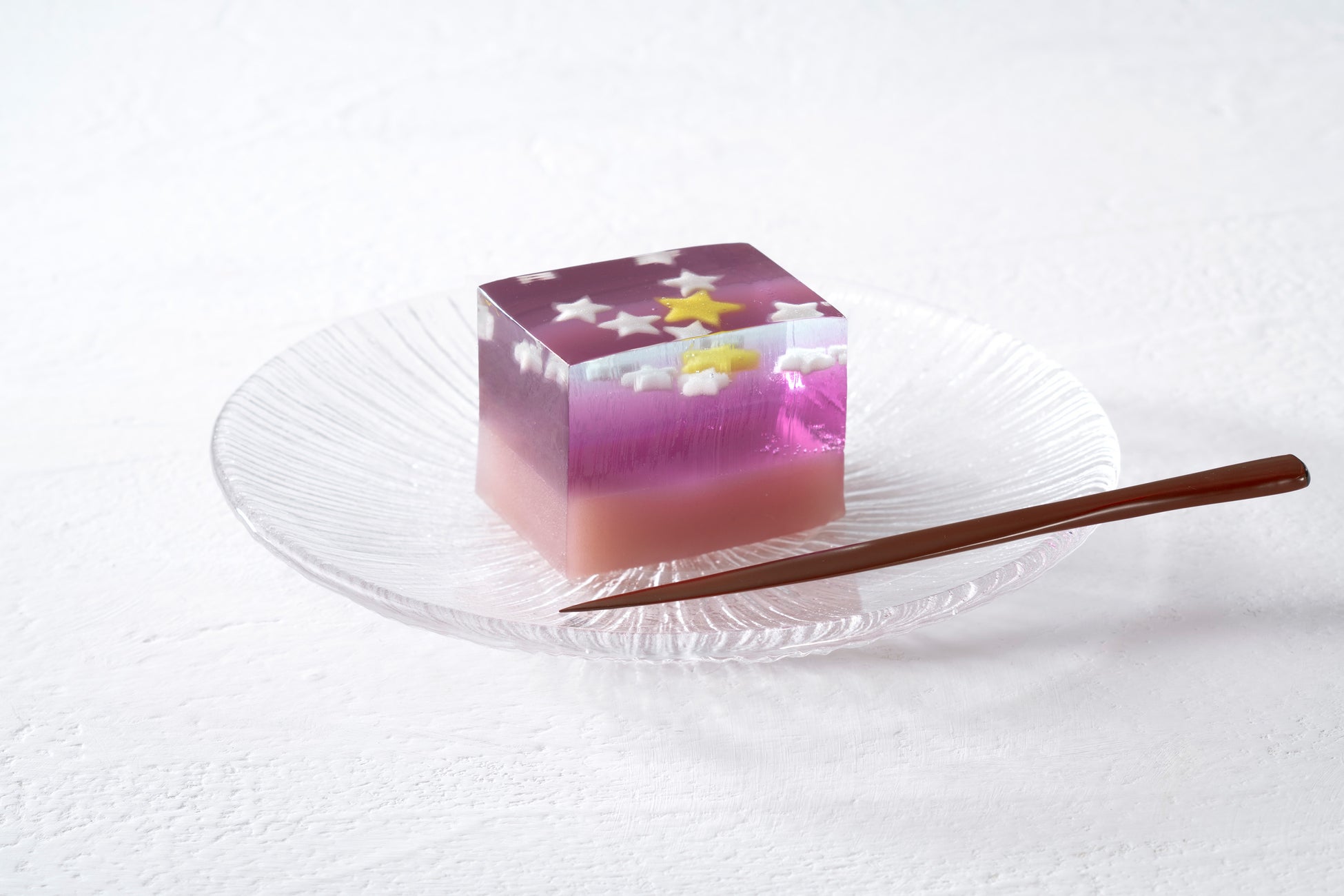 寒天を使用した、つるんとなめらかな琥珀羹(こはくかん)をうす水色と紫色の2色にかさねて、夜空の色を表現。 その下には、優しい甘みにほんのりと塩味を効かせた塩羊羹(しおようかん)を重ねて三層に仕上げました。
