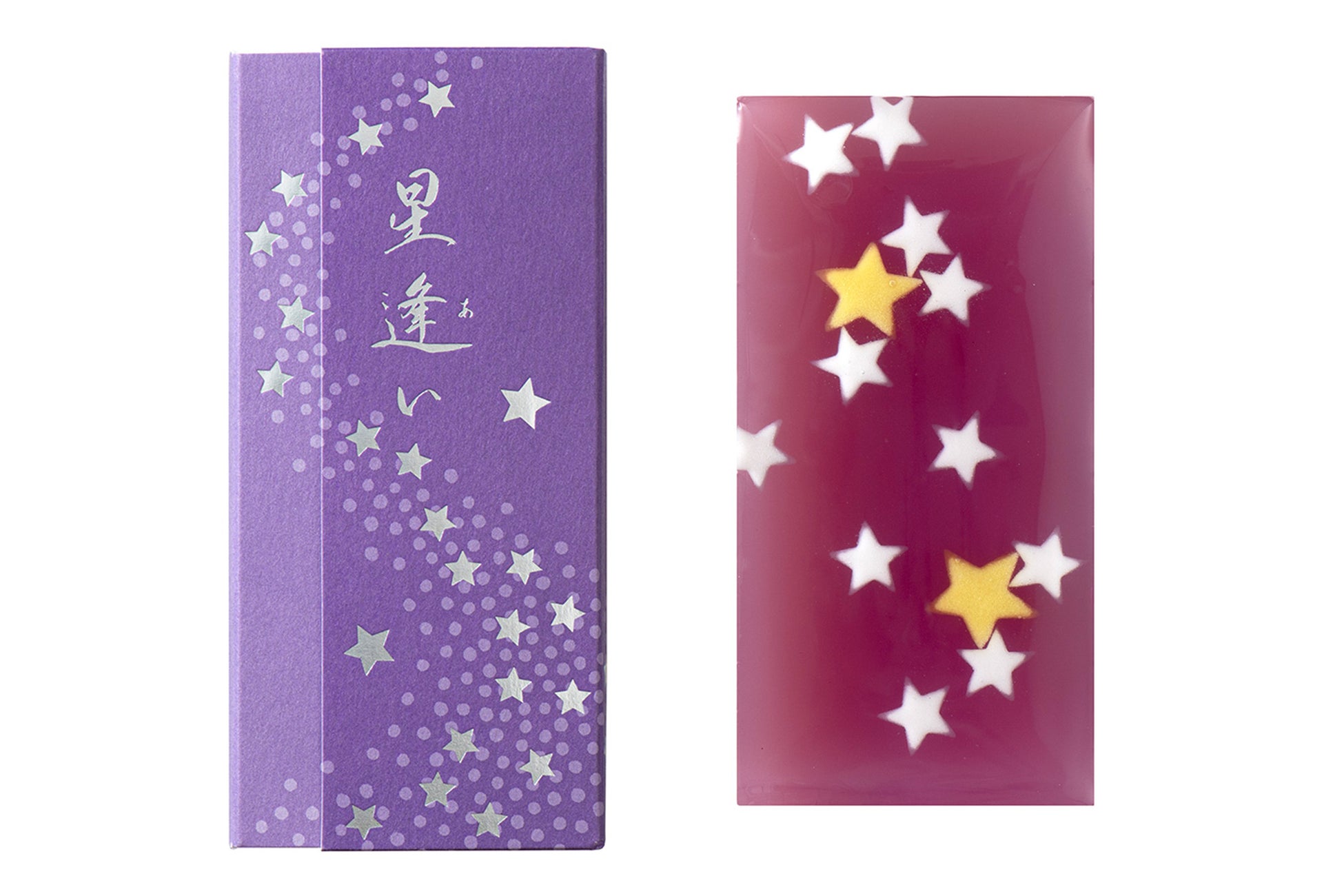 「星逢い」は、「七夕」の物語をテーマにした意匠羊羹です。牽牛織女の1年1度かぎりの出逢いを、和菓子で描く星と天の川で表現いたしました。