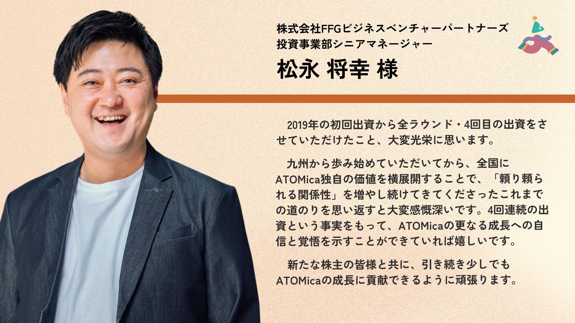 ATOMica創業初年度にあたる2019年末のシードラウンドでリード投資家としてご出資いただいたFFGベンチャービジネスパートナーズには本ラウンドにも引き続きご参画いただき、これまでATOMicaが実施した全4回すべてのラウンドに継続出資いただく運びとなりました。