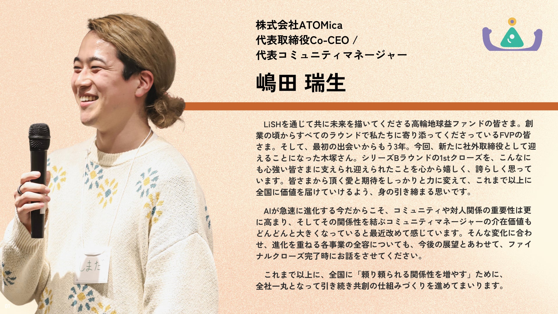 また、「新たなソリューションを生み出し、社会実装するための日本最大級の実験場」というLiSHのコンセプトを体現すべく、ATOMicaのすべてのサービスの根幹である「コミュニティマネージャー」にAIを掛け合わせた新たな価値の創出に取り組み、LiSHを起点に全国へ展開してまいります。