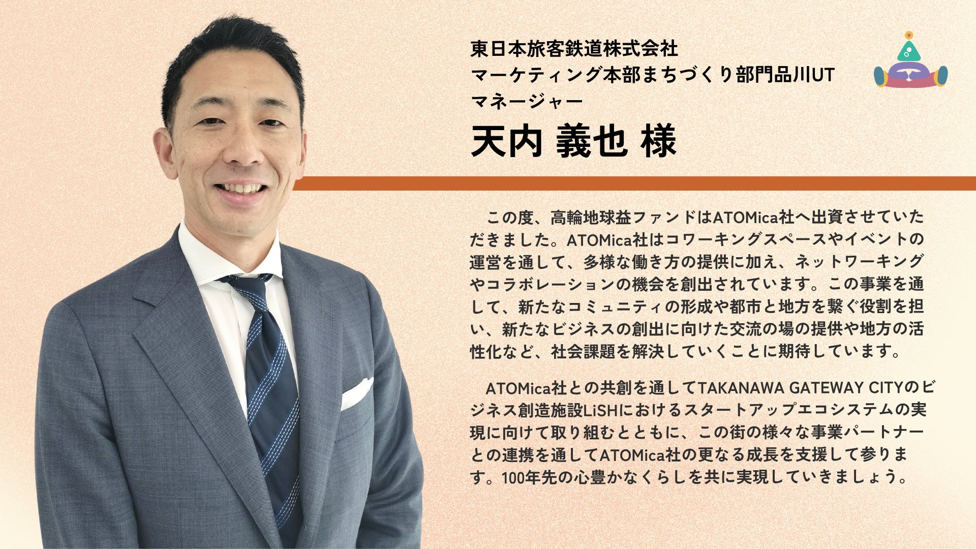 本ラウンドのリード投資家である高輪地球益ファンドは、東日本旅客鉄道株式会社(以下、JR東日本)がTAKANAWA GATEWAY CITYに2025年5月に開設した共創拠点「TAKANAWA GATEWAY Link Scholarsʼ Hub(以下、LiSH)」を起点とし、環境・モビリティ・ヘルスケアを中心としたスタートアップ支援を目的に設立されたもので、ATOMicaはLiSHの企画・運営を担ってまいりました。