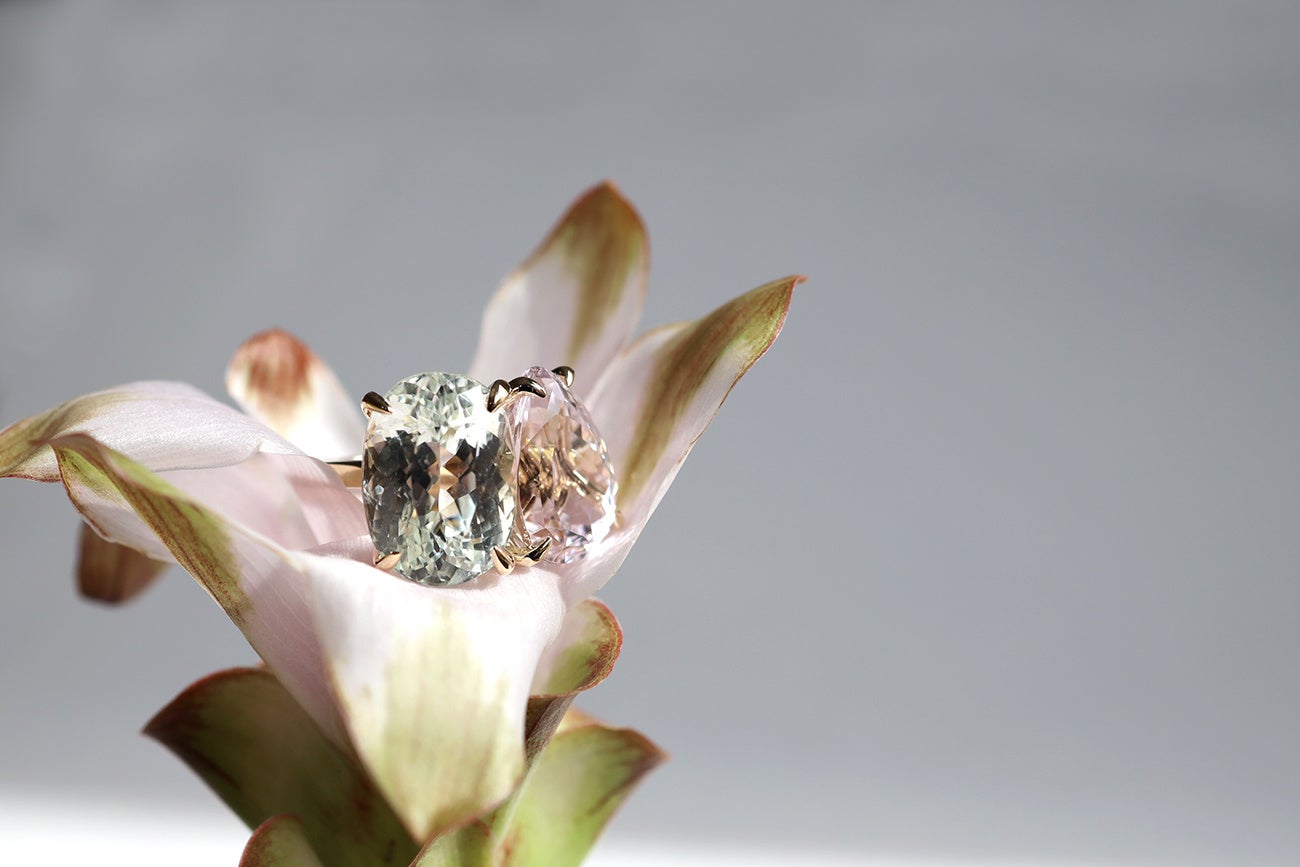 素材本来の美しさを引き出すカットをほどこしアートピースのようなジュエリーを展開する<エツコ ソノベ>。美しいゴールドのルチルクオーツ、人気のメタモルフォーシスクォーツ、希少性の高いブルー系のトルマリン、ライモナイトクォーツ・モルガナイト・ラピスラズリなどの天然石をセットした一点物のリング・ピアスなどの新作コレクションのほか、新しいデザインのパールリングなどもご用意。さらに、下記の日程でデザイナーの薗部悦子氏が来店し、特別にご自分だけのジュエリーをお作りいただけるオーダーも承ります。