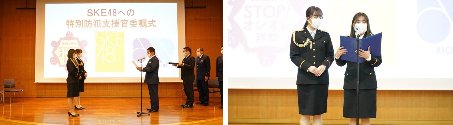 再委嘱式に出席した斉藤支援官、鎌田支援官は、委嘱状を受け取った後、「SKE48は、これまで愛知県警察と共に特殊詐欺を防止するための啓発活動を行ってきました。これからも、特殊詐欺の被害者を一人でも減らすため、あらゆる世代に対し特殊詐欺被害防止活動を積極的に行っていきます。」と決意を語りました。