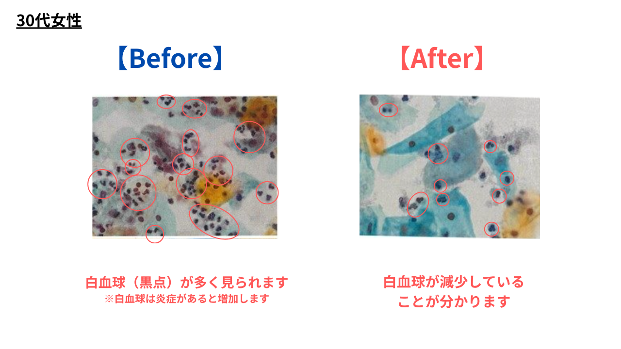 使用前の検査では炎症関連の所見が見られましたが、1ヶ月間の使用後の検査では、膣内環境の改善傾向が確認され、炎症関連の所見は認められませんでした。