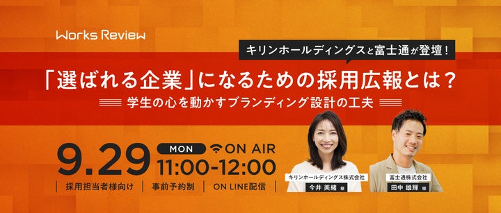 株式会社ワークス・ジャパン(本社:東京都千代田区、代表取締役:清水信一郎)は、2025年9月29日(月)に企業の人事担当者及び人材開発担当者を対象にしたオンラインフォーラム、WORKS REVIEW『キリンホールディングスと富士通が登壇!『選ばれる企業』になるための採用広報とは?〜学生の心を動かすブランディング設計の工夫〜』を開催します。