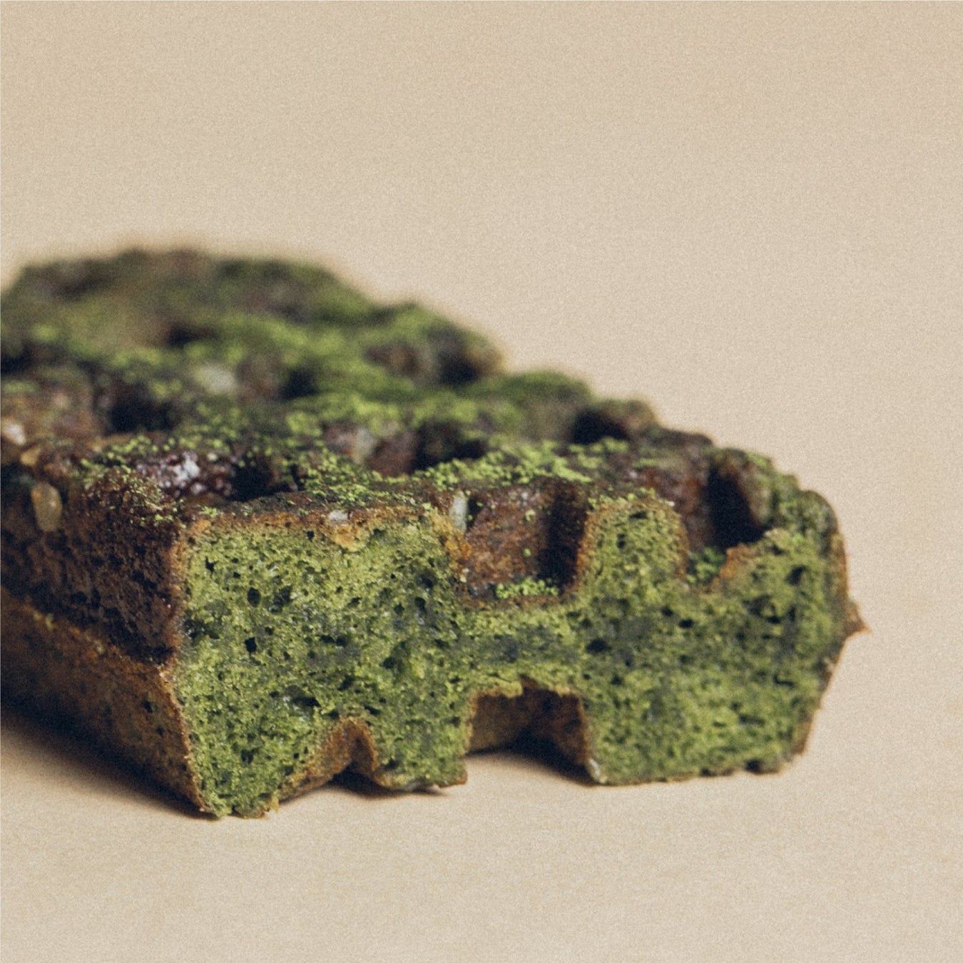 大粒ザラメの入った京ワッフルの生地に、抹茶粉を贅沢に練り込み、断面まで抹茶色をした濃厚なフレーバー。宇治抹茶フレーバーの京ワッフルには抹茶チョコレートを、ぶ厚くコーティング。宇治抹茶の京ワッフルの上にはミルクチョコレートを垂らし、京都生まれの彩り華やかなぶぶあられをトッピング。ビジュアルも食感も楽しんでいただける仕上がりに。