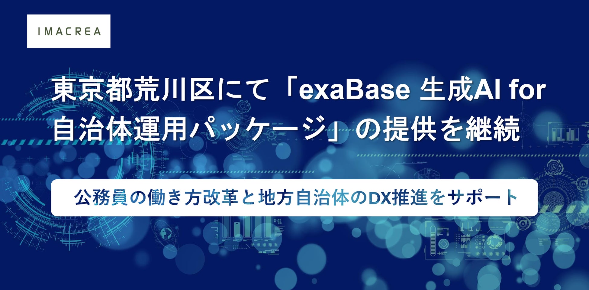 株式会社イマクリエ(本社:東京都港区、代表取締役:鈴⽊信吾、以下、当社)は、東京都荒川区において、令和6年度に引き続き令和7年度も「exaBase 生成AI for 自治体運用パッケージ」の提供を継続することをお知らせします。