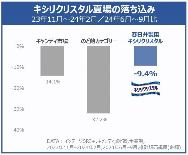 のど飴の需要は乾燥する冬にピークを迎える一方で、夏ののど飴需要は冬に比べると1/3程度落ち込みます。しかし「キシリクリスタル」は、夏でも一般的なのど飴需要の落ち込みの半分程度にとどまり、安定した需要を維持しています。