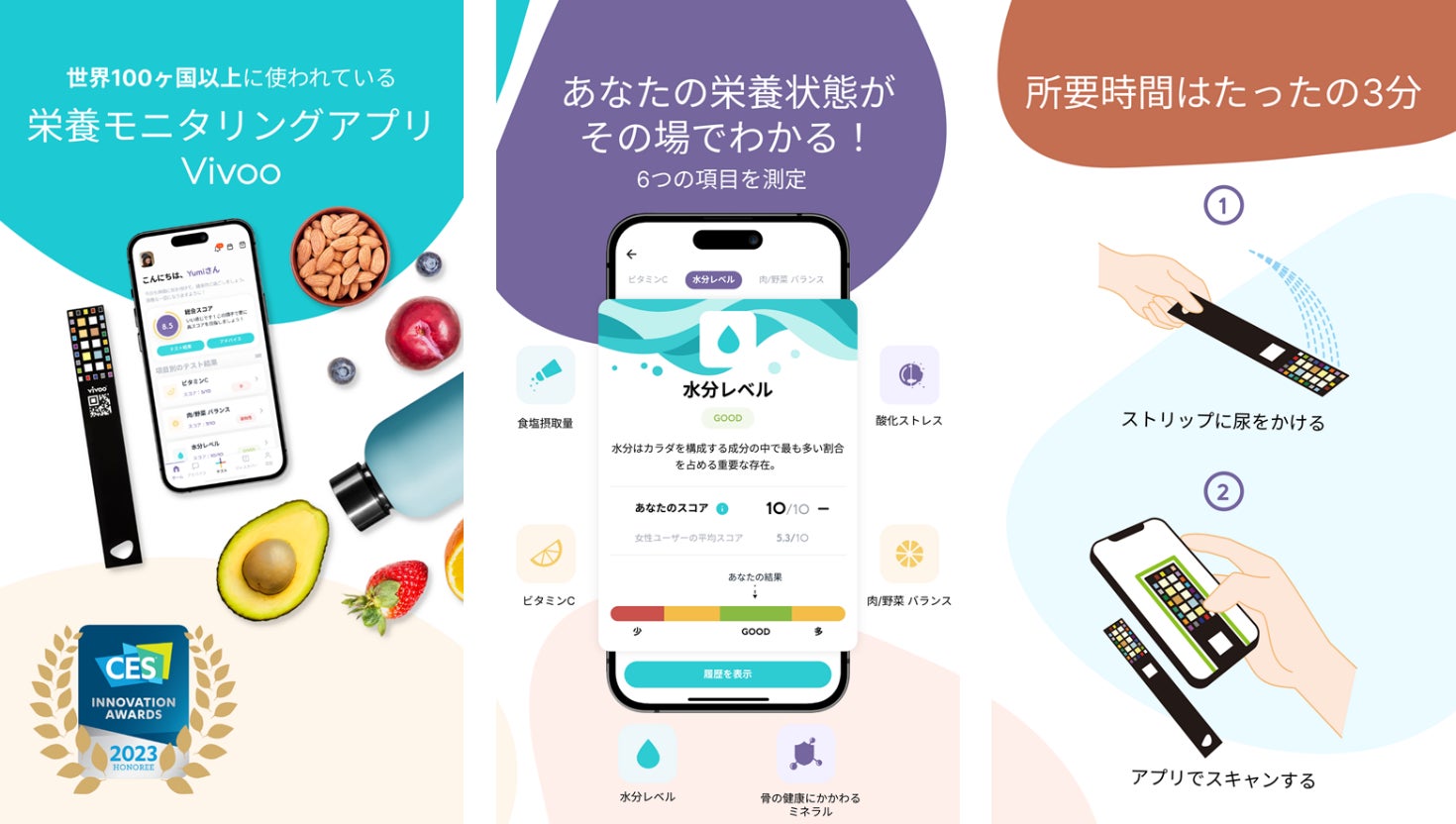 今回提供を開始する日本版Vivooは、尿をかけたストリップ(試験紙)を専用アプリ(以下「Vivooアプリ」)で読み取ることで、ビボセンス社独自のテクノロジーである人工知能と画像処理技術により自身の栄養状態をその場で測定し、その測定結果に合わせて管理栄養士が監修した食や生活習慣のアドバイスを提供するサービスです。