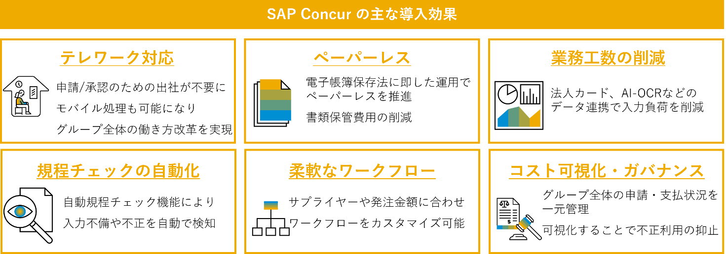 SAP Concurの導入により、経費精算業務の作業時間削減が実現、モバイルアプリの活用で場所や時間を問わず、申請・承認作業の実施が可能になります。