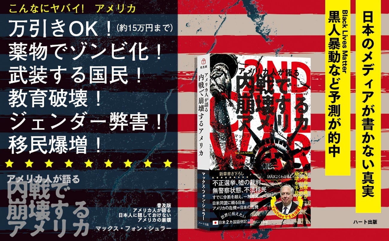 米海兵隊員として来日して49年、以来日本の文化に親しみ、日本人を愛し、それ故に日本人の自虐史観に我慢ができず、日本人に代わり常に日本の立場で発信活動を続けてきたマックス・フォン・シュラー氏。現在は、主にYoutubeなどのSNSにて「アメリカの悲惨な現状」について情報配信をし大反響を呼んでおります。