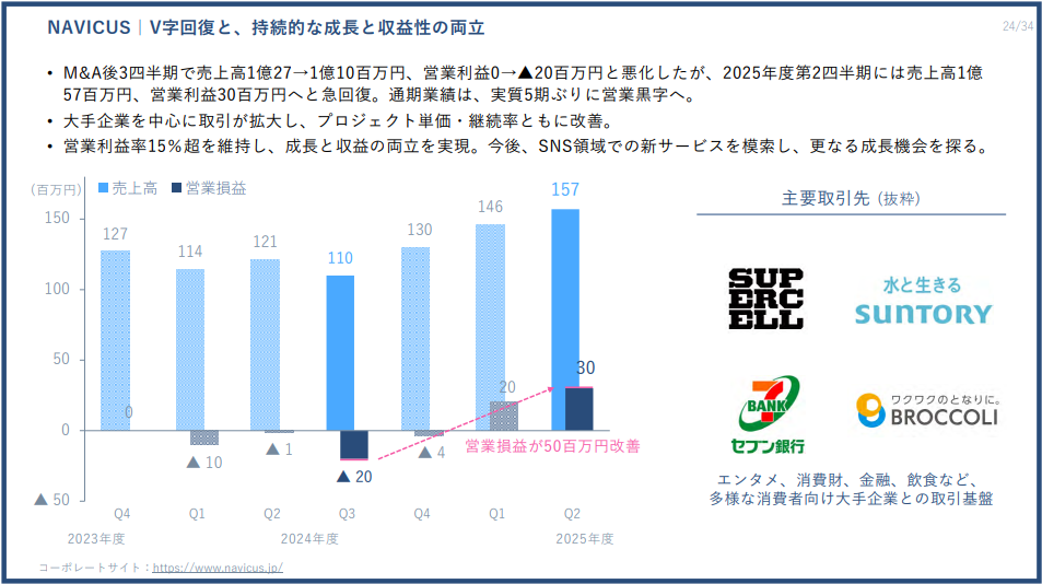 NAVICUSは、SNSマーケティングおよびコミュニティ支援を中心とした事業を展開しており、PR TIMESグループに参画した後の2024年度第3四半期には一時的に売上高1億100万円・営業損失2,000万円まで落ち込みましたが、2025年度第2四半期には売上高1億5,700万円、営業利益3,000万円へと急回復しました。