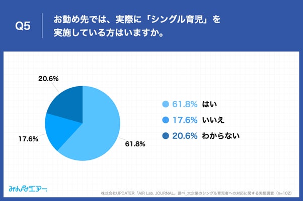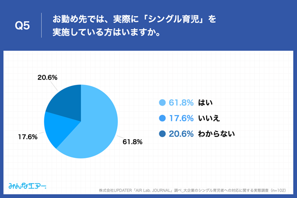 - 61.8%の大企業が、自社に「シングル育児者」が在籍していると回答 「Q5.お勤め先では、実際に「シングル育児」を実施している方はいますか。」(n=102)と質問したところ、「はい」が61.8%、「いいえ」が17.6%という回答となりました。