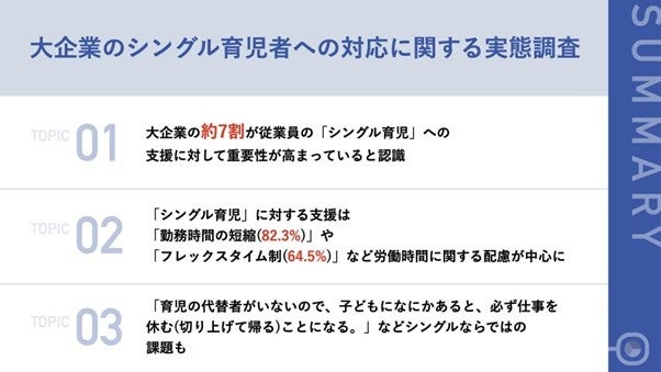 - 大企業の約7割が従業員の「シングル育児」への支援に対して重要性が高まっていると認識
