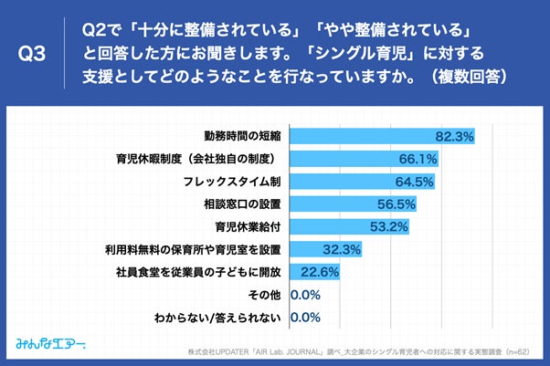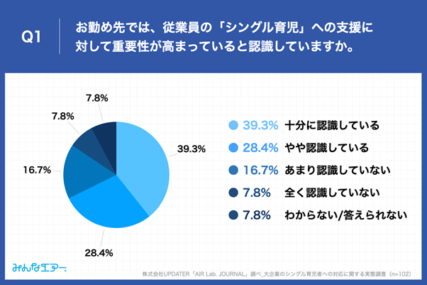 「顔の見えるライフスタイル」の実現を目指す株式会社UPDATER(所在地:東京都世田谷区、代表取締役:大石英司)のWell-being tech事業「みんなエアー」(https://minnaair.com/)は、2022年8月30日(火)に開催する『みんなの働き方EXPO』でのセッションテーマの一つである「誰も取り残さない働き方〜シングル育児とシングル介護(https://minnaair.com/blog/week2022-expo/#session3)」に関する緊急調査として、従業員数1,000名以上の企業の人事担当者102名に、大企業のシングル育児者への対応に関する実態調査を実施しました。