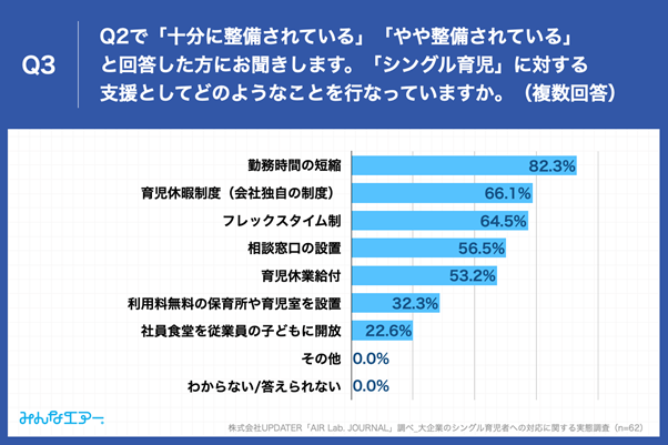 - 「シングル育児」に対する支援は「勤務時間の短縮(82.3%)」や「フレックスタイム制(64.5%)」など労働時間に関する配慮が中心に