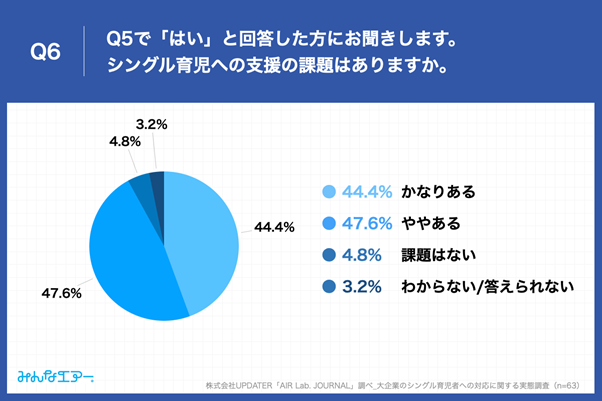 現在、61.8%の大企業がシングル育児をしている社員の在籍を把握している一方で、ほとんどの企業が支援の課題があると回答しています。育児支援の関する職場の理解が得られないなど内容に加え、「育児の代替者がいないので、子どもになにかあると、必ず仕事を休む(切り上げて帰る)ことになる」など、シングル育児による仕事への影響を懸念している企業もいるようです。