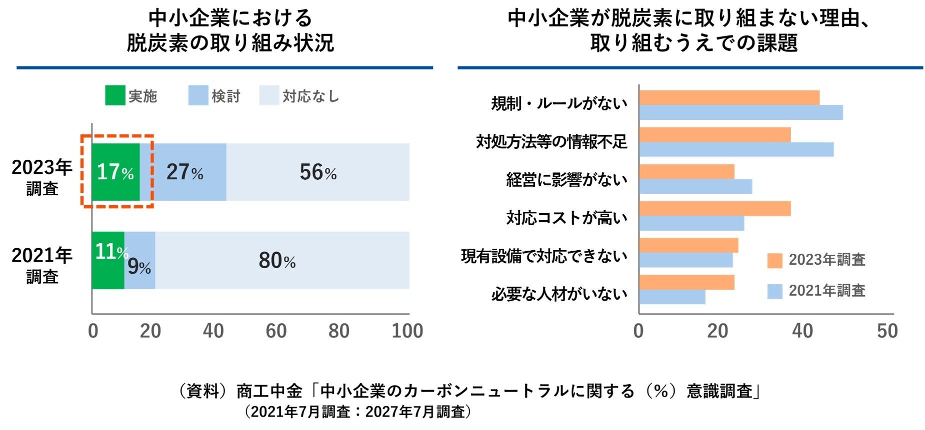 政府は「2030年100%LED化」を掲げているものの2024年度(2024年1月統計)時点で58%(※1)と進捗は鈍く達成の見込みがありません。また、中小企業における脱炭素の取組み状況は2割(※2)にも満たず、その背景には情報開示義務や投資家からの要請がないことに加えて、ひっ迫する資金面やビジネス影響の情報・人材不足があげられ、企業が自力で取組むことは容易ではありません。