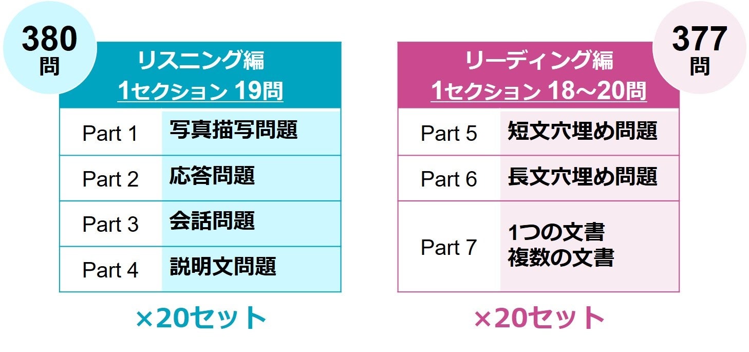 リスニング編は380問、リーディング編は377問とテスト4回分に近い問題数が収録されています。また全ての問題は、TOEIC Listening & Reading Testを開発・制作するETSが本番のテストと同じクオリティで制作しています。