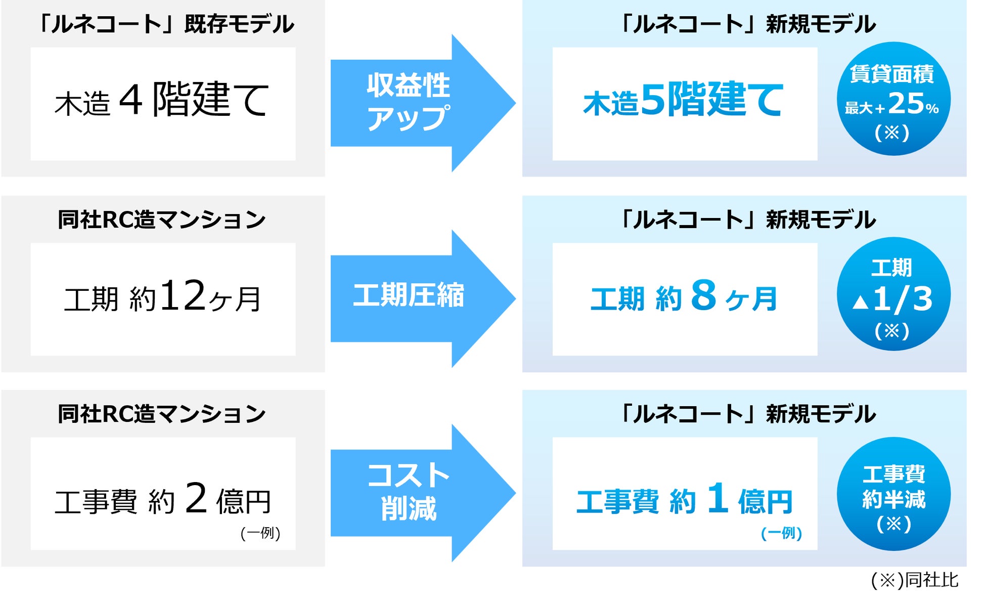 本取り組みは、新日本建物が展開する「ルネコート」シリーズの新たな商品ラインナップとして、既存の4階建てモデルより高層の『木造5階建て』モデルの開発を行うものです。これまで同モデルの実現を困難なものとしてきた建築規制上の課題を技術開発により解決、従来の4階建てに対し賃貸面積が最大25%増加する他、同等規模の当社RC造マンションと比べ、工期を3分の1程度圧縮可能なことなどにより建築コストが約半減するため、これまで収支不採算により事業化が困難であった案件についても取り組みが可能となるなど、既存の木造モデルやRC造マンションと比較し収益効率や事業機会といった観点で優れたモデルとなります。また同モデルは、居住にともなって生じる二酸化炭素排出量を抑える措置を講じた低炭素建築での開発を計画しており、カーボンニュートラルな社会の実現に寄与するものでもあります。