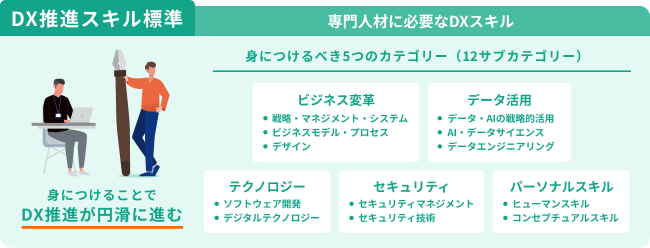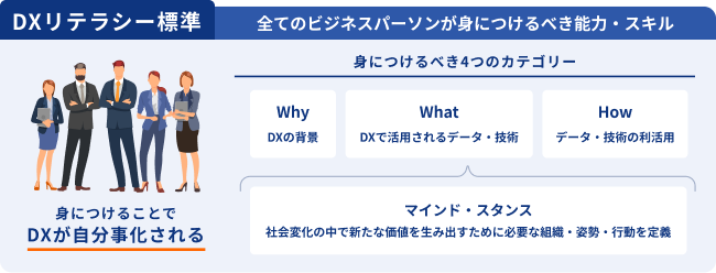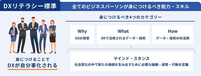 「DXリテラシー標準」は、その成果を仕事や生活で役立てるうえで必要となる学びの項目として、「Why (DXの背景)」「What(DXで活用されるデータ・技術)」「How(データ・技術の利活用)」「マインド・スタンス」を示しています。また「DXスキル標準」は、DXを推進する人材に共通して求められるスキルを、5つのカテゴリー・12のサブカテゴリ―で整理しています。