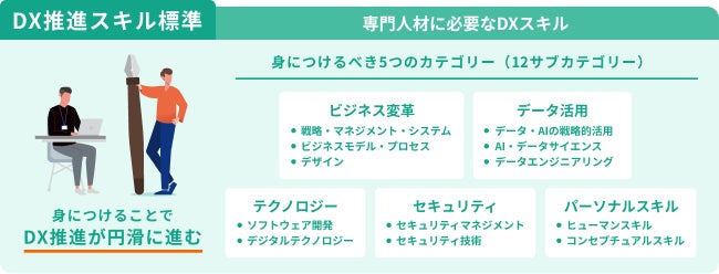 「デジタルスキル標準」とは、データ活用やデジタル技術の進化による産業構造の変化を背景に、経済産業省と独立行政法人情報処理推進機構(IPA)が取りまとめた、個人の学習や企業の人材育成・採用の指針。ビジネスパーソン全体がDXに関する基礎的な知識やスキル・マインドを身につけるための指針である「DXリテラシー標準」、及び、企業がDXを推進する専門性を持った人材を育成・採用するための指針である「DXスキル標準」の2種類で構成されます。