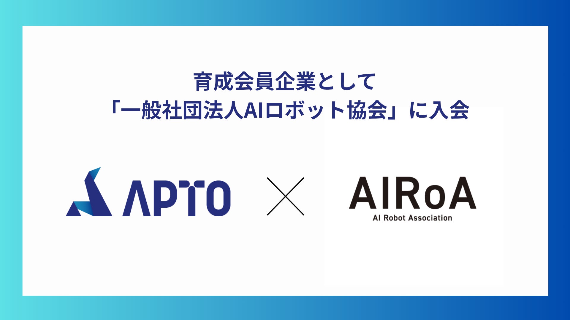 株式会社APTO(本社:東京都、代表取締役:高品良)は、一般社団法人AIロボット協会(英称:AI Robot Association、略称AIRoA)に育成会員企業として入会しましたので、お知らせします。