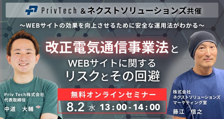 【共催Webセミナー】ネクストソリューションズ × Priv Tech『改正電気通信事業法とWEBサイトに関連するリスクとその回避策』8月2日(水)13時開催