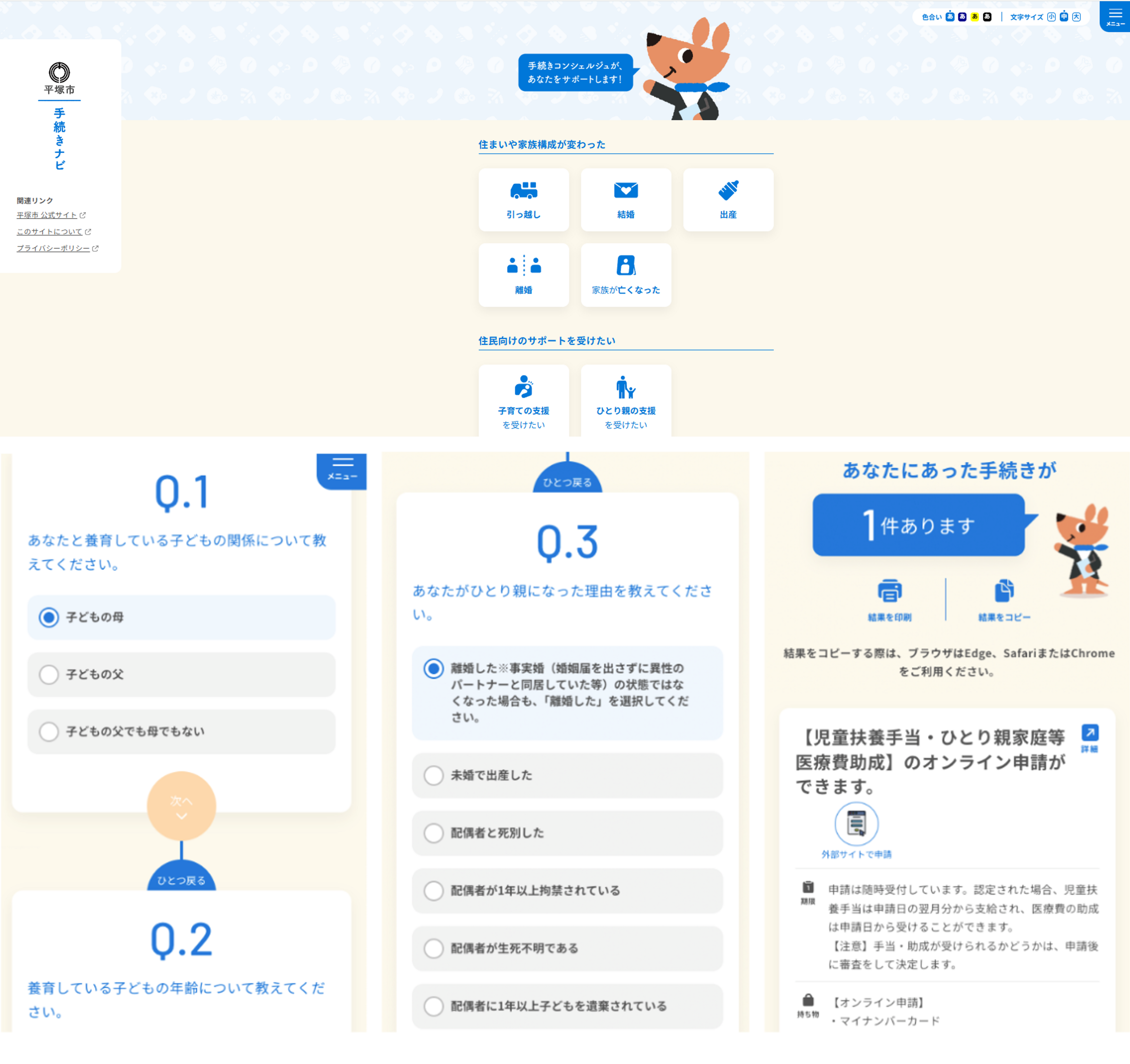 平塚市版ひとり親家庭支援ナビの最大の特徴は、従来の「制度一覧」や「手続き説明」にとどまらず、自分の状況を整理しながら、必要な支援と次の行動を見つけられる点にあります。