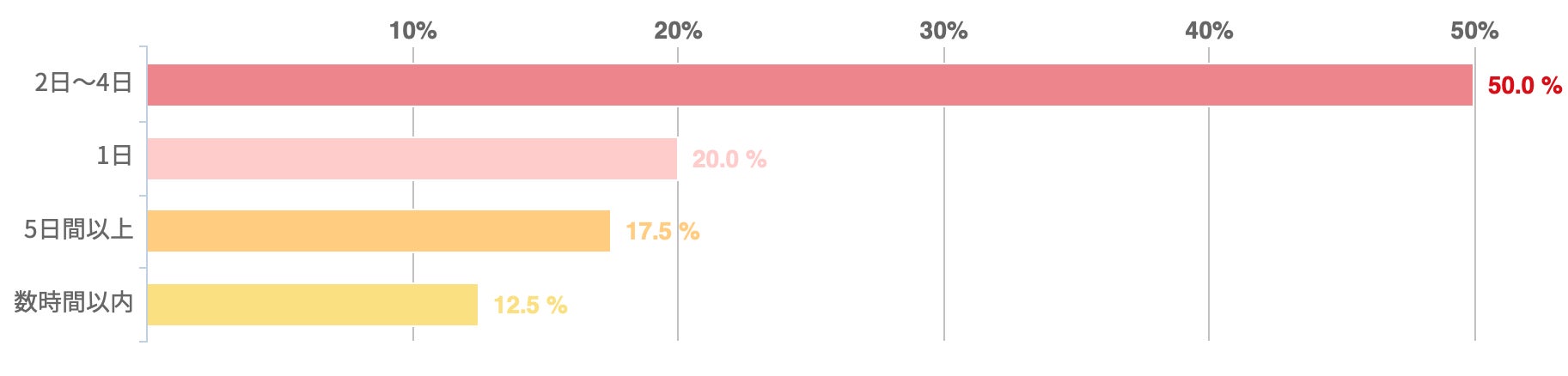 アンケートによれば、受け取るまでの時間で最も多かったのは「2日〜4日(50.0%)」であった。そこから、「1日(20.0%)」、「5日間以上(17.5%)」が続き、「数時間以内(12.5%)」という回答が最も少なかった。
