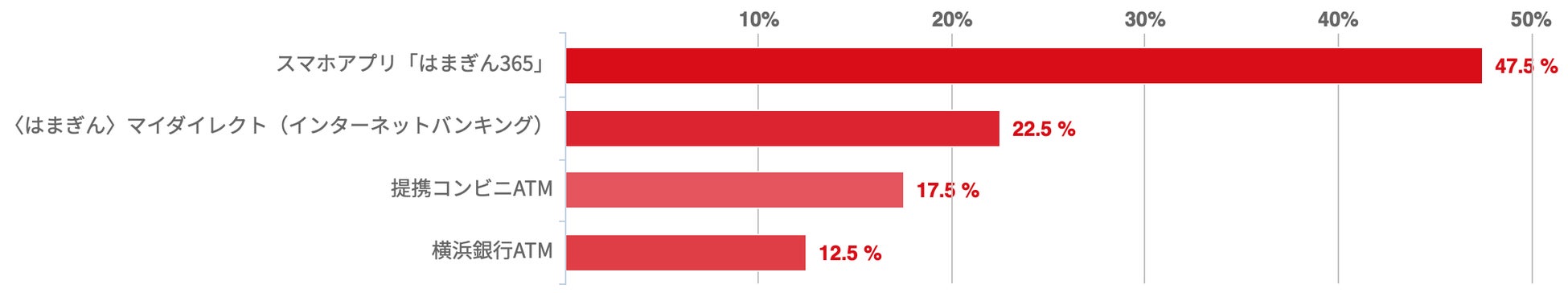 アンケートによれば、「スマホアプリ『はまぎん365』(47.5%)」が最も多くの回答者から利用されていることがわかった。次いで、インターネットバンキングである「(はまぎん)マイダイレクト(22.5%)」、「提携コンビニATM(20.0%)」が続き、「横浜銀行ATM(10.0%)」を選んだ回答者が最も少なかった。