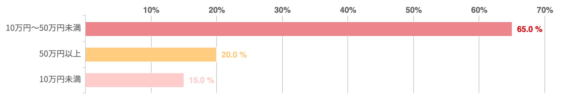 横浜銀行カードローンで実際に借入した金額は「10万円〜50万円未満(65%)」が最も多かった。回答者の借入額には2万円〜100万円と幅があり、利用者が自身の都合に合わせて無理ない金額の借入を行っていることが示されている。