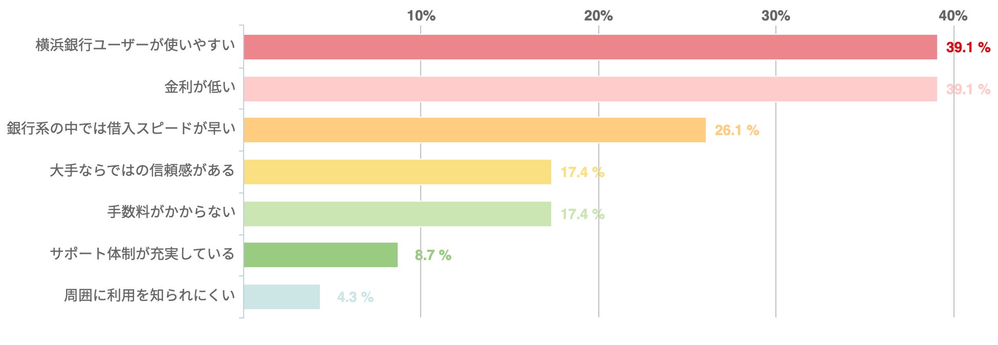 アンケートによれば、横浜銀行カードローンが他社に比べて特におすすめとされる理由としては「横浜銀行ユーザーが使いやすい(39.1%)」と「金利が低い(39.1%)」が主に挙げられた。