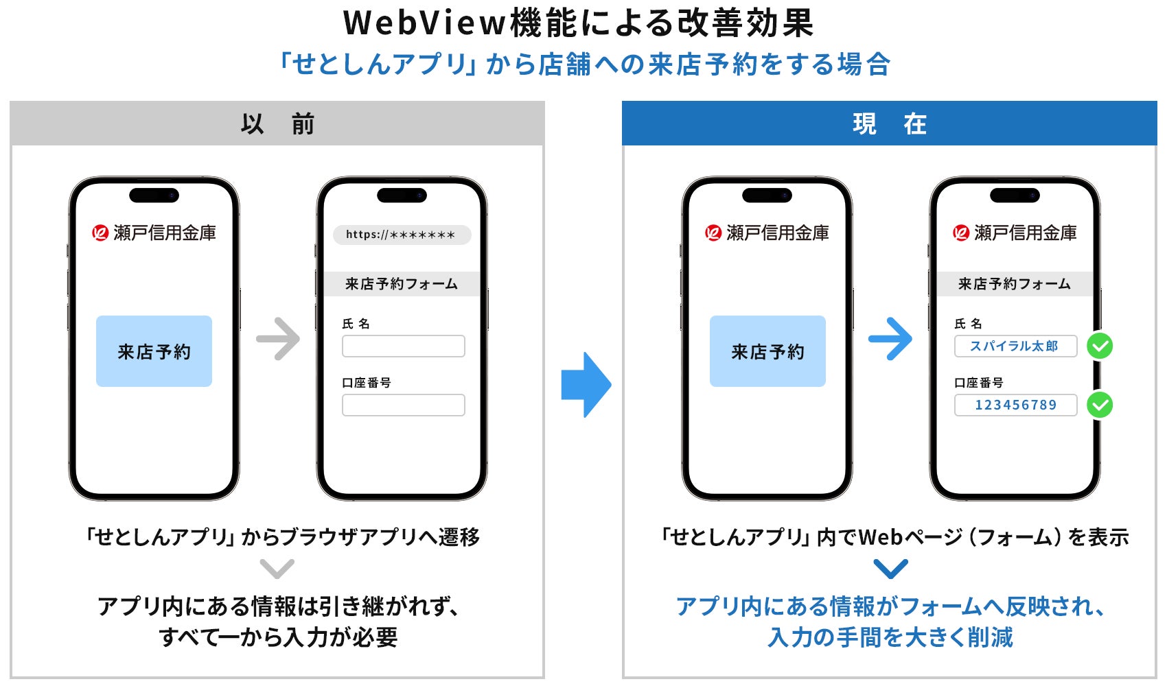 デジタルで未来最適をリードするスパイラル株式会社(東京都港区、代表取締役 CEO 佐谷 宣昭)は、瀬戸信用金庫(愛知県瀬戸市、理事長 稲垣 孝幸)の提供する「せとしんアプリ」にてWebView機能を開発し、ローコード開発プラットフォーム「SPIRAL ver.1」で構築した「来店予約フォーム」との連携をいたしました。これにより、アプリユーザーが「せとしんアプリ」から店舗への来店予約をする際に「せとしんアプリ」内に保持されている個人情報を来店予約フォームへ自動反映して表示することが可能となり、顧客の利便性向上および「せとしんアプリ」の利用促進に寄与しました。このたび、導入インタビュー記事を2025年3月17日に公開しましたので、お知らせいたします。
