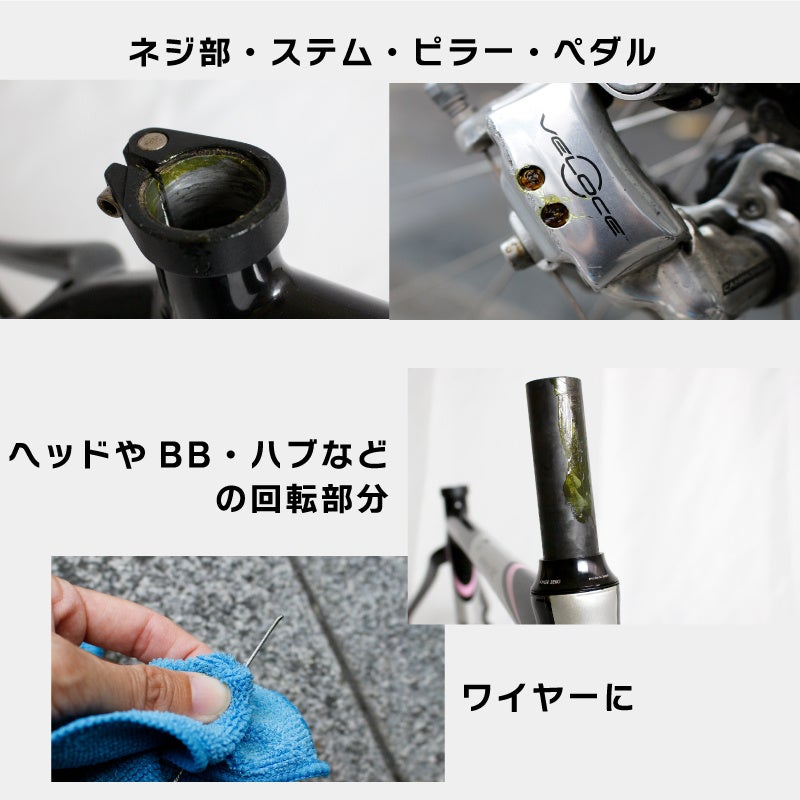 使用箇所 自転車の金属やゴム製パーツ、ハブ・ヘッドパーツ・ボトムブラケット・ベアリング部等駆動部