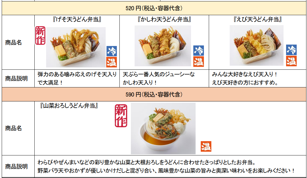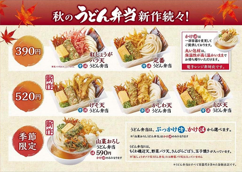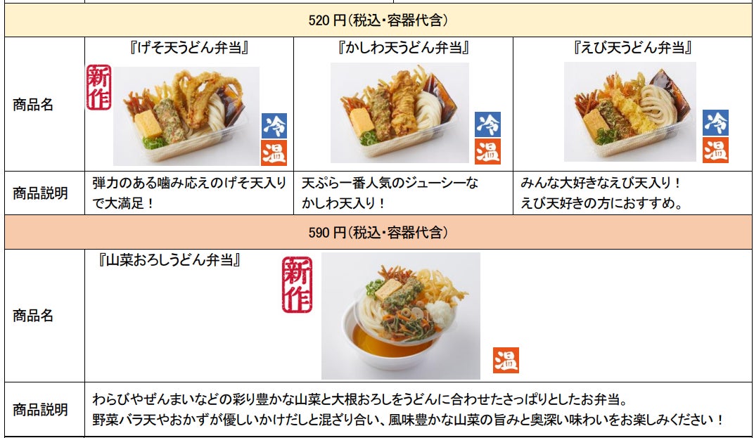さらに、肌寒くなる季節に合わせて、『定番うどん弁当』などは、温かいかけうどんと、冷たいぶっかけうどんの2種類からお選びいただけるようになりました。お弁当ならではの持ち運びしやすいサイズのため、ご自宅での食事はもちろん、行楽シーズンにご家族や友人とご一緒にお好きな場所でお召し上がりください。