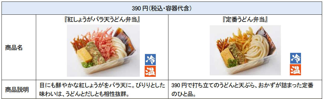 選べる楽しみとお手頃な価格で打ち立てうどんをご堪能いただきたいという想いから、390円ラインアップの『紅しょうがバラ天うどん弁当』を継続して販売いたします。紅しょうがのほどよい酸味とぴりっとした風味がアクセントとなり、うどんとだしとも相性抜群。打ち立てのうどんはしっかり1玉。サクサクのちくわ磯辺天、甘辛い味付けのきんぴらごぼう、だしを効かせたほんのり甘い玉子焼きが入って390円という満足感のあるひと品です。