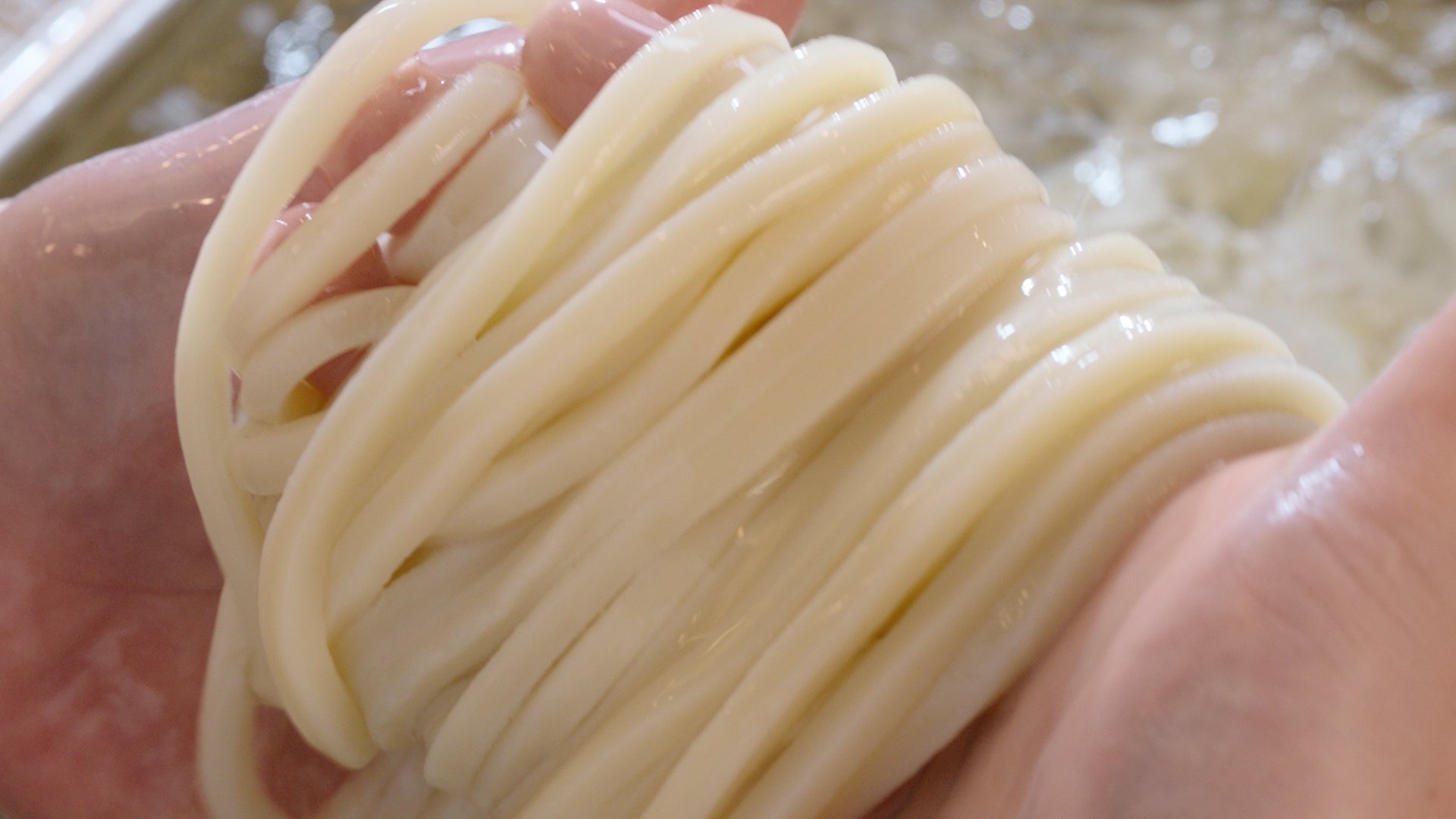 醤油ベースで濃い目のぶっかけうどんは、茹でたての麺を水でしっかりと締めることで、麺の表面に艶ができ、つるつるとしたのど越しと弾力のあるコシを味わっていただけます。