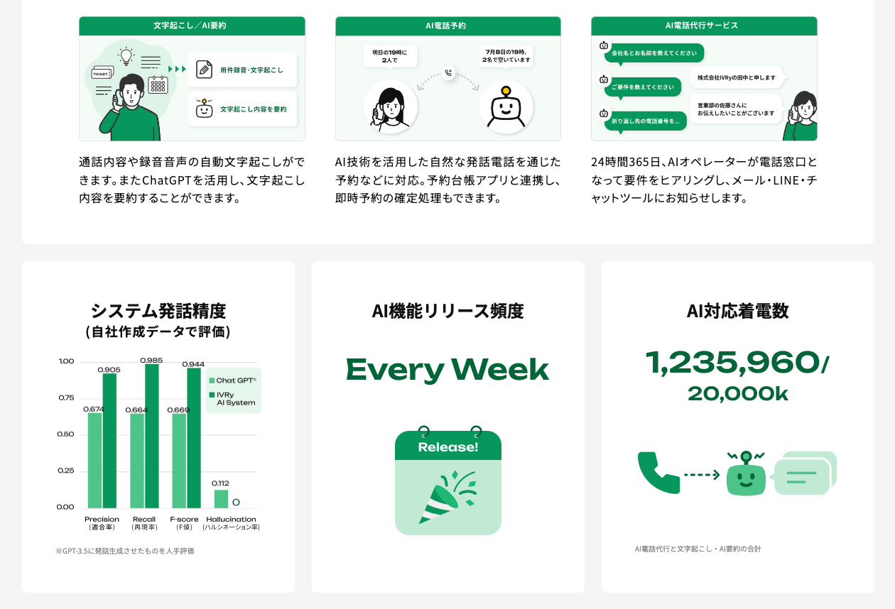 「AI」:AI電話予約機能や、AI電話代行サービス、自動文字起こし・AI要約