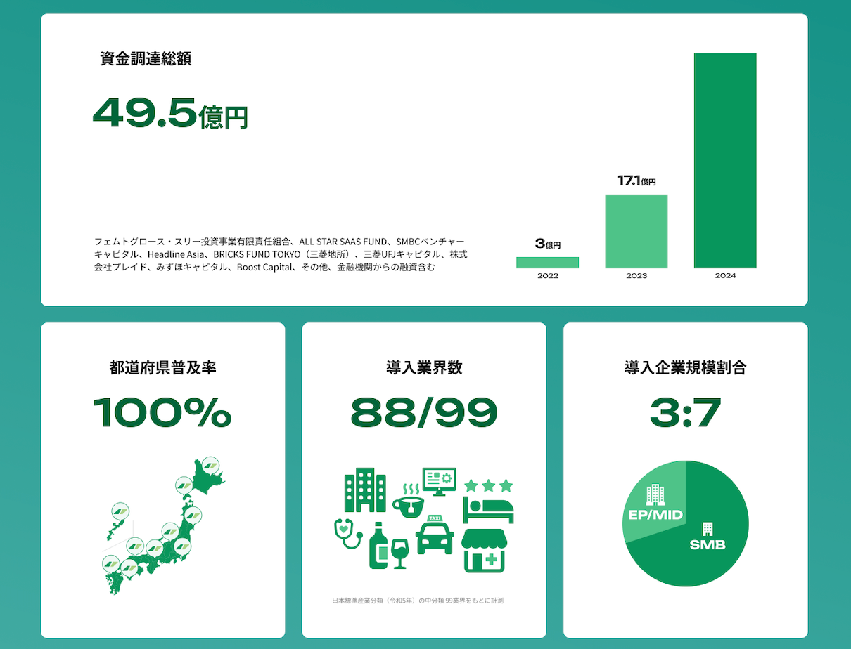 「電話」を起点としたAIプロダクトを展開しており、大手企業から中小企業まで、規模や業種を問わず、ホリゾンタルに導入されており、2024年6月末時点で47都道府県・88業界以上・累計15,000以上のアカウントを発行し、累計2,000万着電を超えて利用されています。