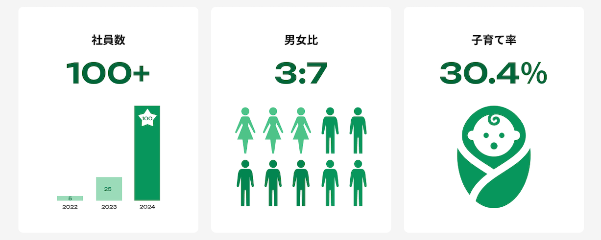 「メンバー」:社員数は100名を超え、組織は前年比3倍のペースで成長しています。グロース責任者、プリンシパルAIエンジニアなど、この1年で入社したメンバーや、社員数、男女比、子育て社員の割合を公開しています。