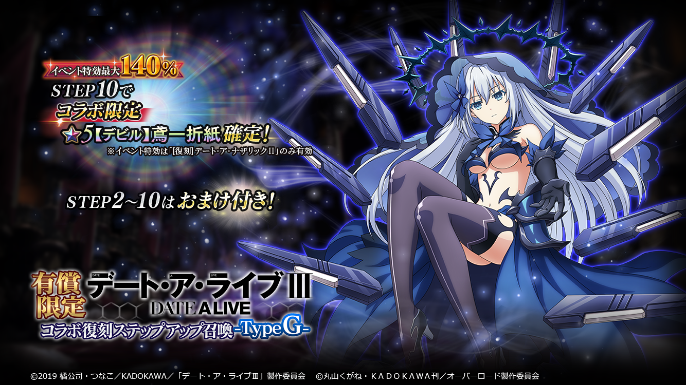 オリジナルコラボイベント『[復刻]デート・ア・ナザリック』『[復刻]デート・ア・ナザリックⅡ』も復刻開催!コラボキャラクターが登場する召喚も同時開催いたします!その他、ログインボーナスや限定ミッションなども実施予定!