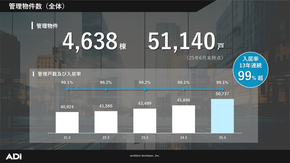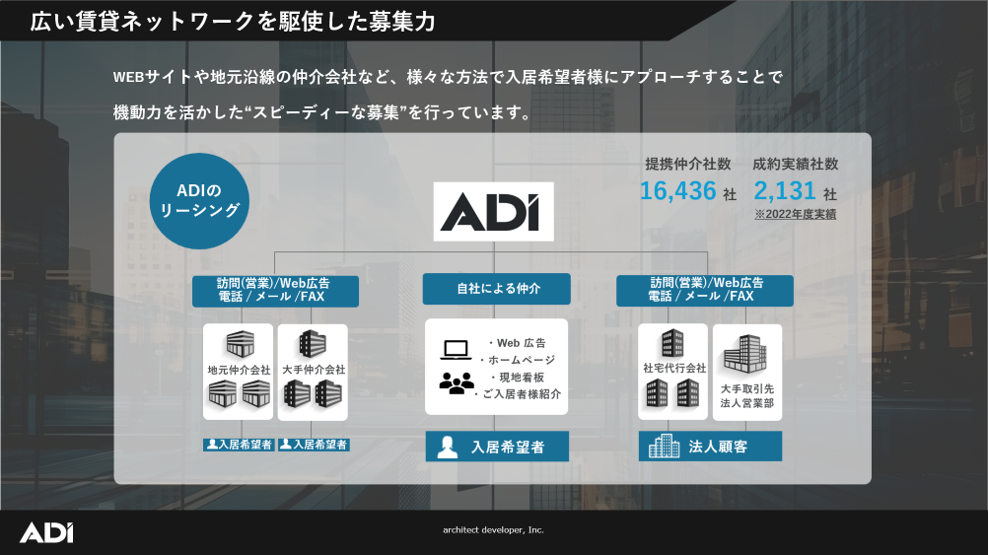 ADIは、「美しい暮らし方を住まいから」という企業理念のもと、人々の暮らしに貢献する企業として不動産運用の最適解を創造し、豊かな未来の実現を目指してまいります。