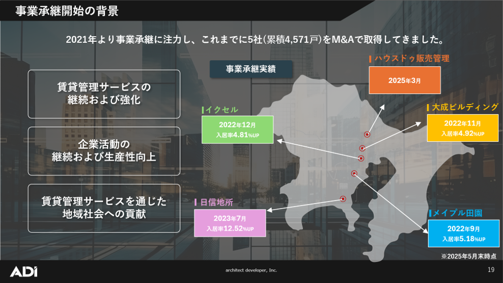 今回、ADIが講師として登壇するに至った背景には、M&Aに関するご縁があります。2025年1月に設立された船井総研グループの「株式会社船井総研あがたFAS」との取引の中で、自社のM&Aに関する基本方針やこれまでの取り組み実績、さらにプロパティマネジメント事業における運営体制について説明を行っていました。その内容が研究会のテーマとも合致したことから、研究会での講師依頼を受け、今回の登壇に至りました。